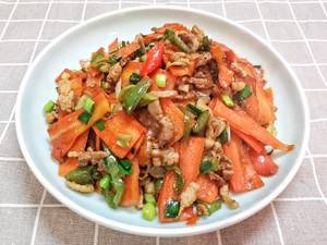 用料:胡萝卜3根、肉150克、大葱1根、青椒3个、朝天椒2个、青蒜2根、老抽半勺、生抽1勺、盐适量。