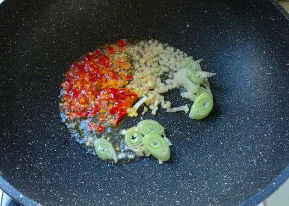 3、炒锅坐火上烧热,倒入适量的食用油,先下葱花、姜末煸炒出香味,再加入剁辣椒酱2勺,煸炒出味。