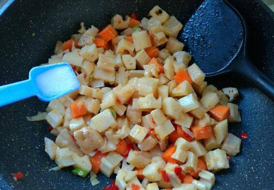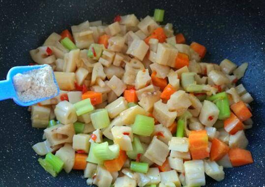 4、先放胡萝卜煸炒1分钟后,再下藕丁翻炒均匀,加入生抽1勺、盐1勺调整味道。