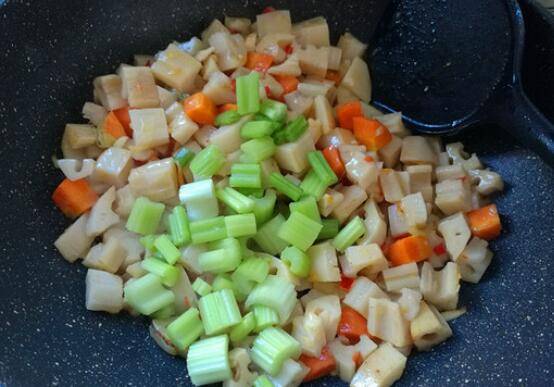 6、打开锅盖,看汤汁收尽把芹菜丁放进去,翻炒均匀。