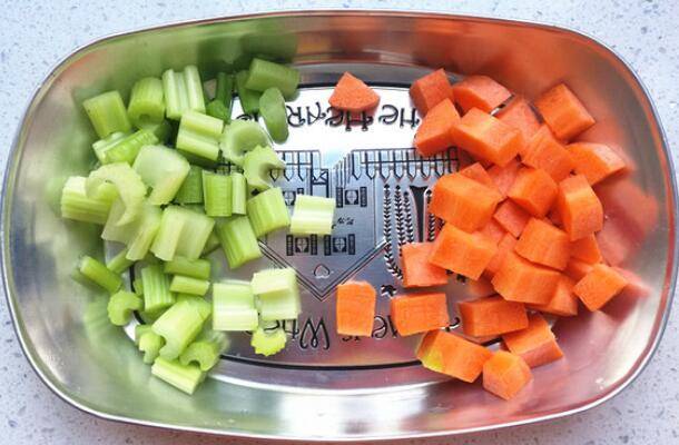 2、胡萝卜半根刮掉皮,清水冲洗干净,然后切成丁,芹菜1根,择去叶子只要茎,清洗干净,一起切成丁。