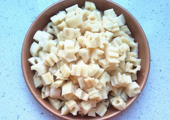 1、鲜藕2节去皮洗净,切成小一点的丁。大葱切成葱花、老姜切成姜末待用。