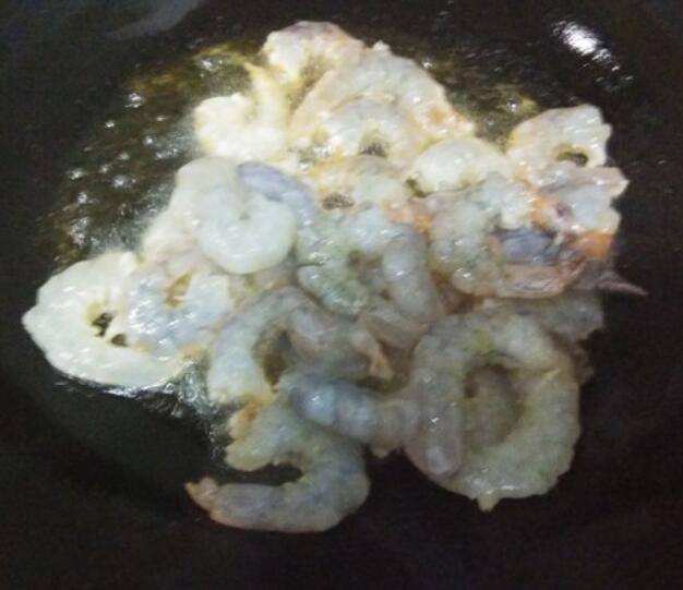 4.锅中放油炒虾仁。