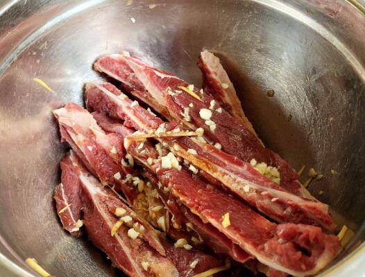 2、在扇子骨里加入1大勺生抽、1大勺料酒,再加入切碎的姜末和蒜末,用手抓匀后腌制4小时。