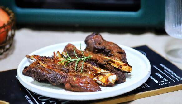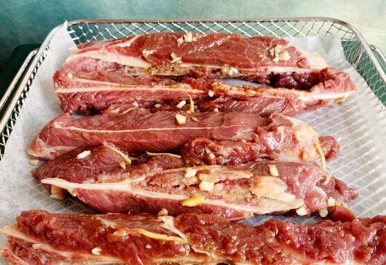 5、烤至6分钟的时候取出烤网,将猪扇子骨翻一个面,放回烤箱继续烤6分钟。