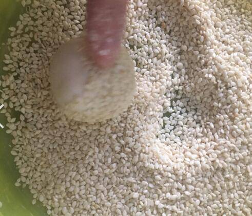 在盘子里平铺芝麻,在手上粘点水揉一下糯米团然后在芝麻上滚满,之后再揉几下确保芝麻粘住了。