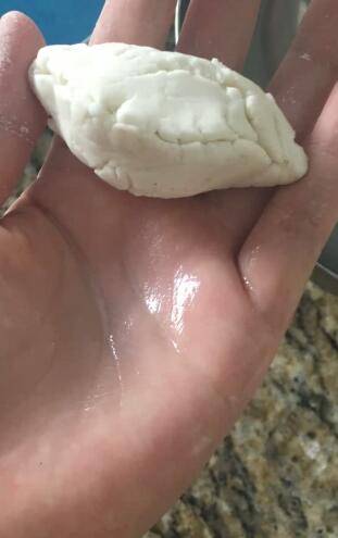 把面团捏成小碗样,放入豆沙馅儿,手掌上粘点水开始揉圆,有裂的时候捏一下就好了,如果水粘多了就多揉几下,糯米团吸水的。
