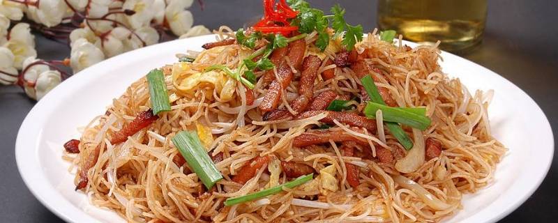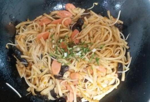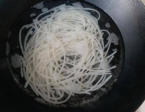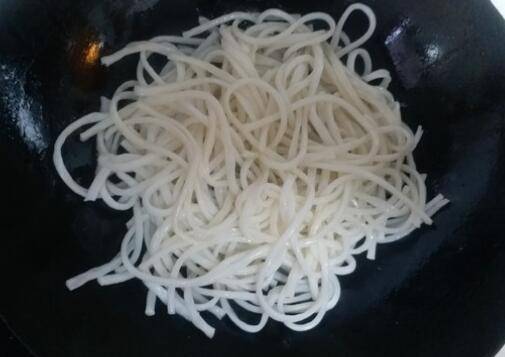 6、锅内再次倒入少量油烧热后倒入米线翻炒。