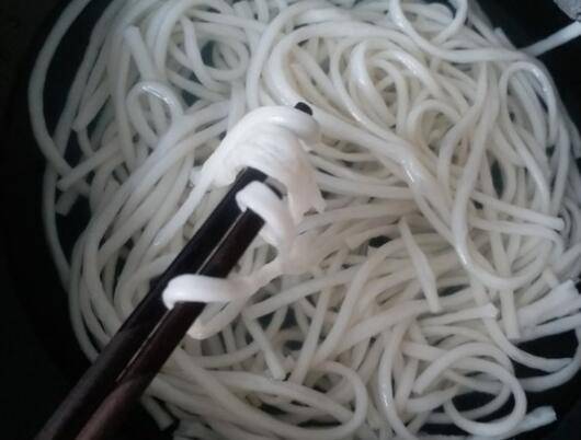 3、米线涨大一圈后就可以捞起。沥干水分待用。