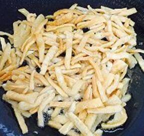 8、煸香大蒜后,放下萝卜干,不停翻炒,直至萝卜干水分完全干透。