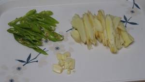 2、嫩姜和青椒切丝,大蒜拍碎。