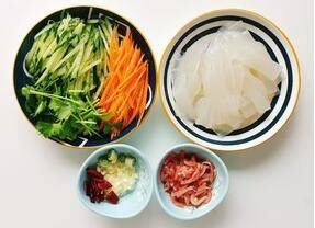 用料:拉皮400克、猪肉丝100克、胡萝卜1根、黄瓜1根、蒜3瓣、香油1勺、生抽4勺、盐5克、糖2勺、香菜2根、干辣椒、葱半根。