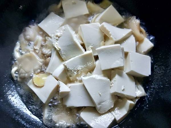4、锅中加入适量水,将豆腐切成小块加入。