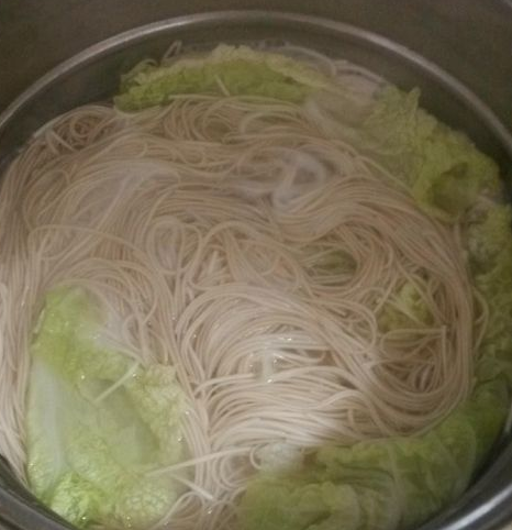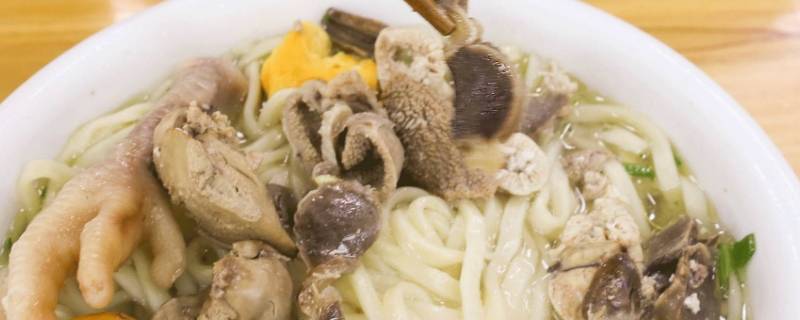 另起锅,水热下入面条,将面条与鸡杂混合即可。