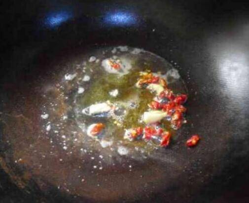 热锅温油放入干红辣椒爆香;