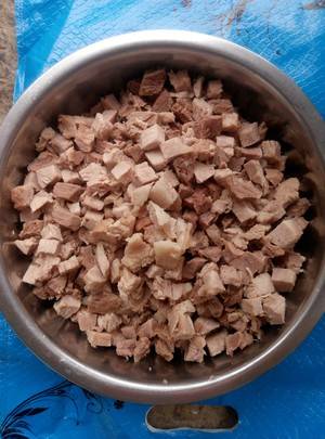 3、把瘦肉、肥肉、猪皮分开切成丁。