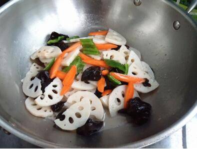 主料:莲藕300克。辅料:油10毫升、盐2克、白糖5克、芝麻油3毫升、木耳6克、胡萝卜15克、青椒10克、葱姜5克。