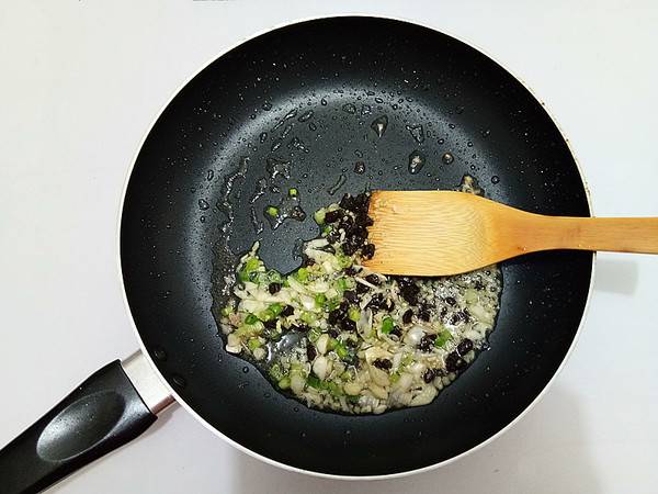 7、用锅中余油爆香葱姜蒜末、豆豉。