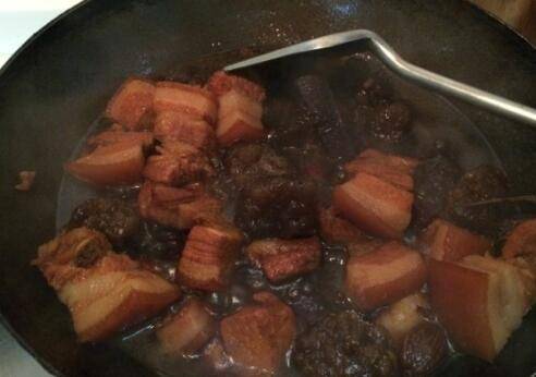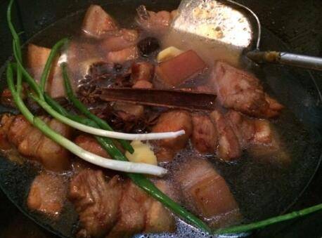 12、加酱油、黄酒、老抽少许。大火烧开后小火炖1小时左右,把做好的山芋粉圆子放入肉中,加稍许盐。