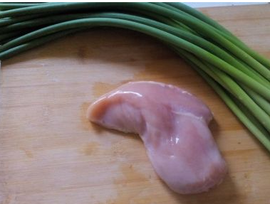 将蒜苔切成段,鸡肉和胡萝卜切成条;