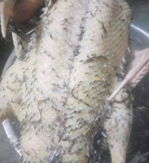 加盐 鸭子宰杀后, 即刻用冷水将鸭毛浸湿, 然后再用热水烫。