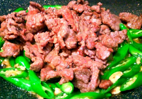 4、锅里的原油,发蒜泥炒香,再加青辣椒翻炒片刻,炒至青辣椒断生,放入牛肉片,加生抽一勺,快速翻炒,起锅。