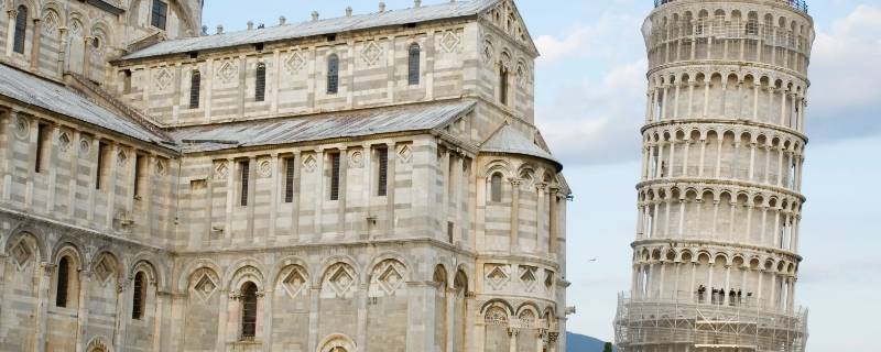 斜塔全名叫比萨斜塔,坐落于意大利的比萨城。斜塔是比萨城内一组古建筑群中的钟楼,于1174年动工兴建,1350年完工。塔身全部用大理石材料砌成,共八层,高约54米。底层有大石柱15根,上面的各层为30根,顶层12根,钟就挂在顶层。