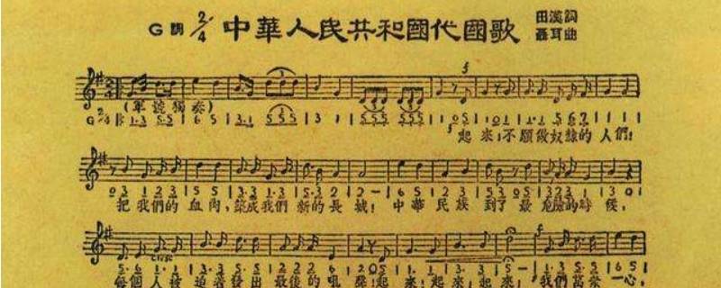 《义勇军进行曲》歌词作者写于1935年,是由田汉作词的革命歌曲,电影《风云儿女》的主题歌。中华人民共和国成立后,《义勇军进行曲》成为中国国歌,并于2004年正式写入《中华人民共和国宪法》,成为中华人民不可侵犯的象征。