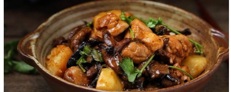 5、将碎鸡肉和香菇下锅翻炒,放入土豆加水。