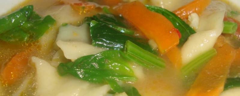 5、面片:面片藏是族家庭常吃的一种面食,具有独特的民族风味。它的做法是将普通的面粉加温水揉成一团,但略揉得软一点,然后用刀将面切成4寸长的厚块,摆整齐、表面涂上少许食油,再将干净湿布盖上待用,将羊肉切成小方块后加上葱粒一起爆炒,再加适量的盐,最后加水,烧开成肉汤,将备好的面取一条在案板上压成扁长形,然后慢慢地抻,抻得长长地绕在左手腕上,用左手大拇指和食指掐住一端,用右手一小块一小块地拉断往肉汤锅里丢,煮熟即可食用。