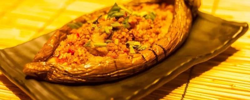 2、龙船茄子:在去芯、蒸熟、去皮的茄子上,铺上厚厚一层用豆瓣酱和糟辣椒混合而成的特制酱,加上大蒜、姜末炒香的剁肉即可。