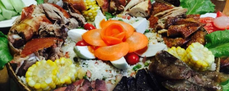 3、傈僳族手抓饭:用大米与包谷砂或豆米、荞米混合在一起煮熟,盛在簸箕上,盖上烤乳猪肉、鸡肉块、鸡蛋、腊肉、竹叶菜、菌子、木耳、花生、凉拌野菜、洋芋、洋丝瓜等各种肉和蔬菜制成。吃饭时,洗手作碗筷,围着竹簸箕坐成一圈,先拈一片腊肉往左手掌上涂一层油,而后以右手当筷子,抓起自己想吃的东西放进左手里进行的组合,再喂进嘴里。