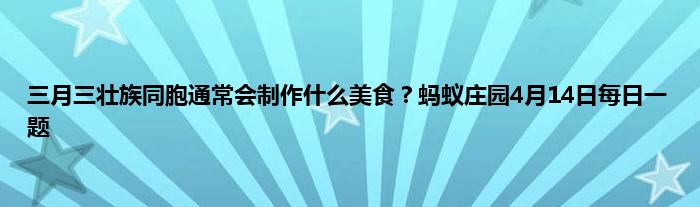 大家好,今天是4月14日,蚂蚁庄园今天的问题已经出来了,和上巳节有关,问题是“三月三”壮族同胞通常会制作什么美食?,那么问题的答案是什么呢,答对的可以获得小鸡饲料用来喂养小鸡,小编收集和整理了相关答案以及解析,下面一起来看看吧!