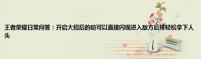 小编今天给各位玩家朋友们带来的是王者荣耀日常问答:开启大招后的铠可以直接闪现进入敌方后排轻松拿下人头,有记得的玩家朋友吗?不记得也没有关系,小编已经帮助大家把王者荣耀日常问答:开启大招后的铠可以直接闪现进入敌方后排轻松拿下人头找了出来,你只需要动动你的小手就可以轻松知道啦,快来瞧一瞧吧。