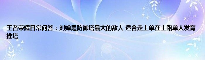 今天来聊聊关于王者荣耀日常问答:刘婵是防御塔最大的敌人,适合走上单,在上路单人发育推塔的文章,游戏是很多人的选择,但是游戏玩多了也会身心疲惫,现在就为大家来简单介绍下王者荣耀日常问答:刘婵是防御塔最大的敌人,适合走上单,在上路单人发育推塔,希望对各位小伙伴们有所帮助。